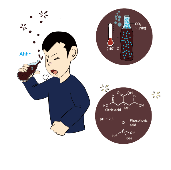 Cola contains carbon dioxide (CO2), organic acids such as citric acid and phosphoric acid, caffeine, and sugars as its main components.