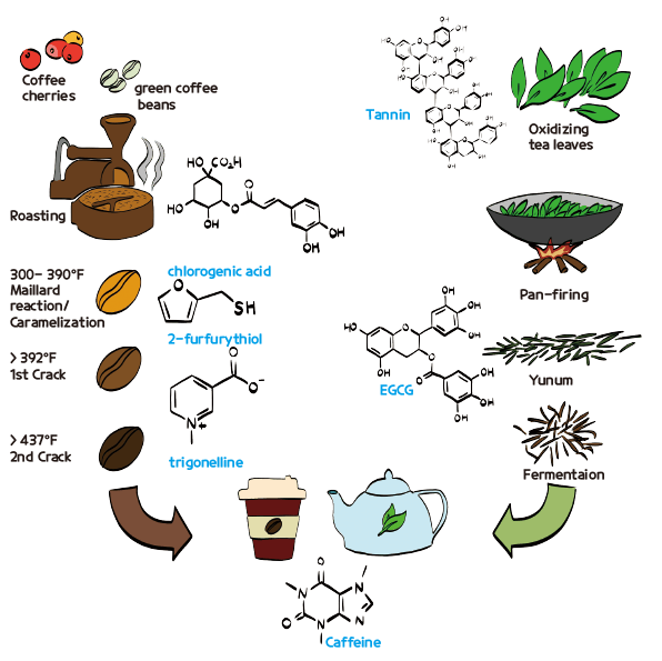 Coffee and tea are fundamentally very similar beverages. They are aqueous solutions made by extracting organic and inorganic substances contained in coffee beans and tea leaves using hot water. Both tea and coffee contain various aromatic compounds. Aromatic compounds are substances that have a scent, are generally volatile, and can easily be detected by the olfactory system. In both coffee and tea, caffeine is the main active ingredient. The unique aroma and caffeine content are likely reasons why coffee and tea have long been beloved as representative beverages by many people.