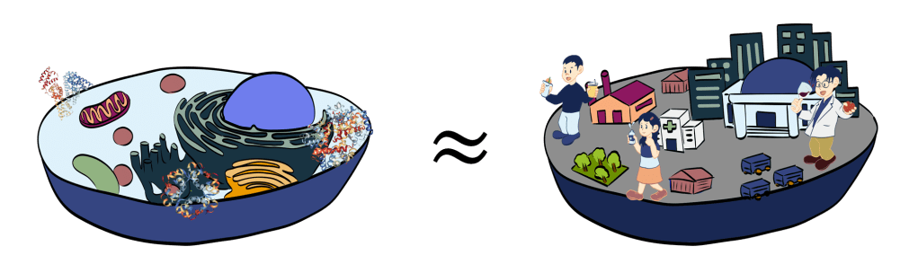 - Cells are like cities where proteins interact with lipids and carbohydrates.