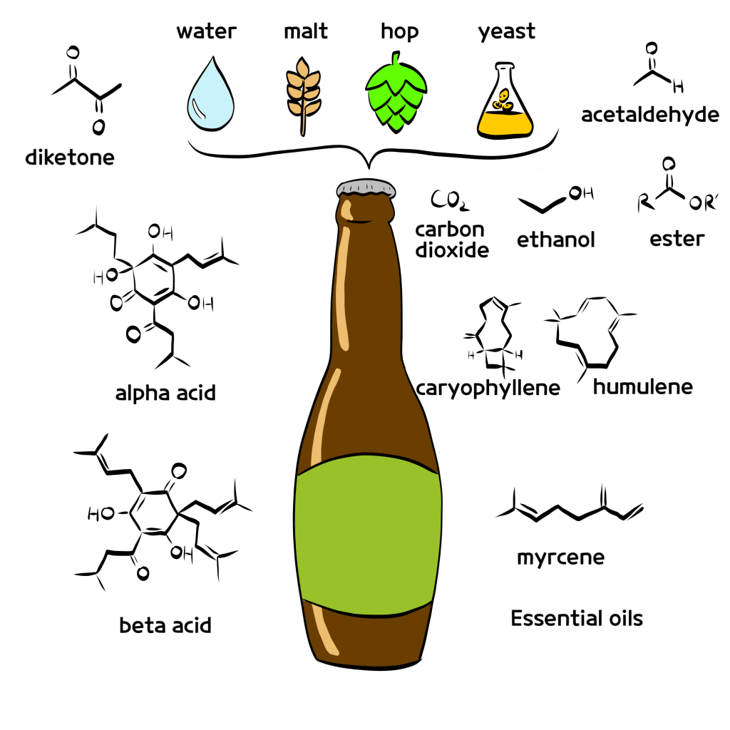 Hops, the flowers of the hop plant, add a distinctive flavor and aroma to beer. The first documented use of hops in beer dates back to the 9th century. Today, hops are used in all beers. Hops contain alpha acids, beta acids, and essential oils, which contribute to the beer’s aroma. The most important alpha acid molecule is humulone, which isomerizes during the boiling of wort, imparting a bitter taste to the beer. Beta acid lupulone oxidizes during fermentation, adding a different kind of bitterness. Around 250 essential oils have been identified in hops, with myrcene, humulene, and caryophyllene playing significant roles in beer aroma. These volatile compounds tend to evaporate during brewing, so hops are added after fermentation or by various other methods to enhance the beer’s aroma.