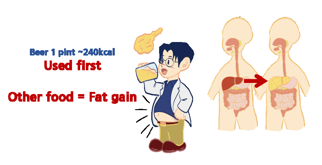 When we drink beer, the 175 kcal from alcohol per can is used first. Additionally, ethanol promotes the synthesis of triglycerides in the liver, making the extra calories from food more easily stored as fat. For instance, buying and consuming four cans of beer from a convenience store adds about 1,000 kcal to your intake. The calories from the accompanying snacks are stored more efficiently in your body. Most cases of abdominal obesity are due to high caloric intake from frequent drinking, combined with low physical activity and a low basal metabolic rate.