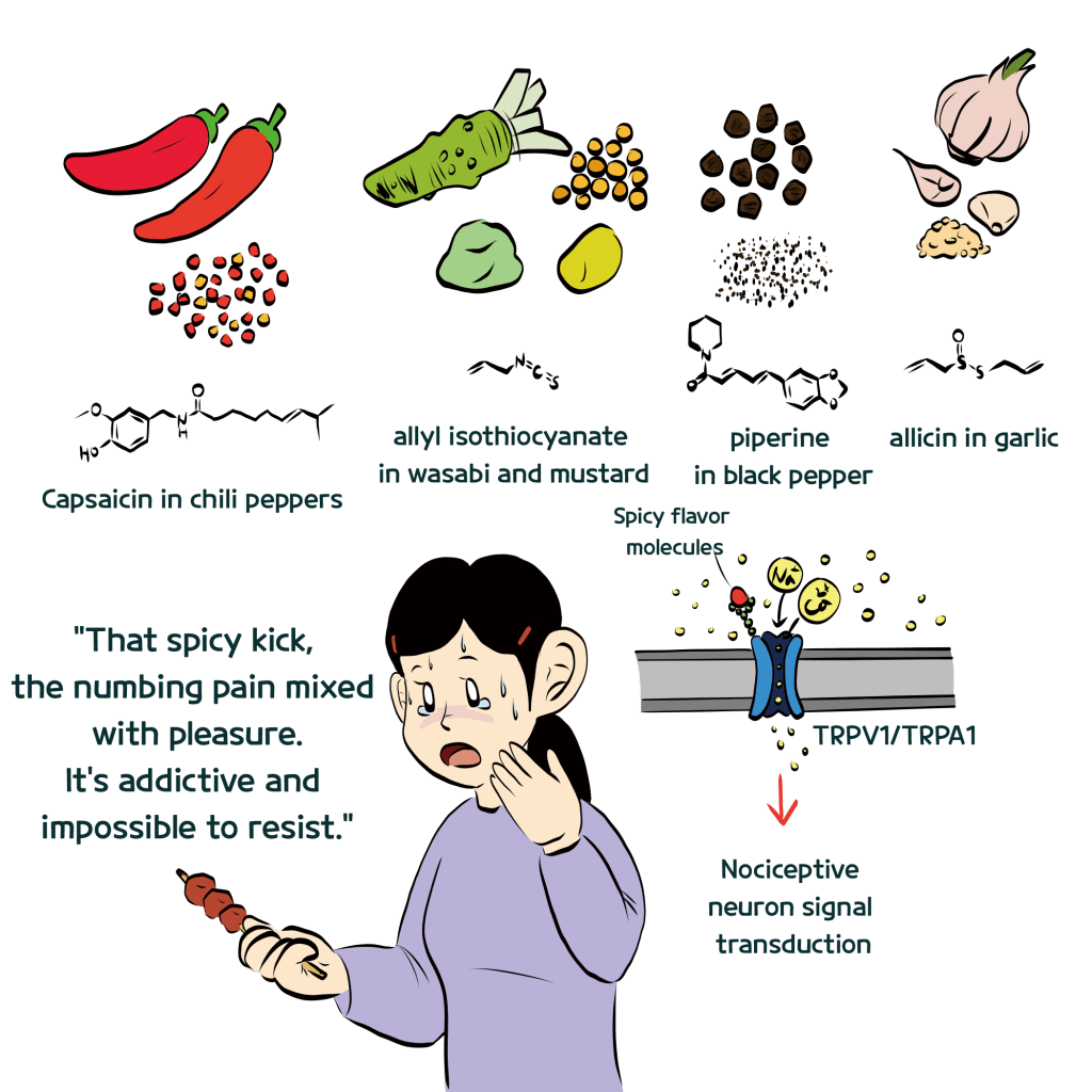 Spiciness is not actually a taste. Unlike salty, savory (umami), sweet, bitter, and sour tastes, which are detected by specific receptors on taste buds, spiciness is a sensation similar to pain. It is perceived through receptors found in pain-sensitive nerve endings. Most of us know from school that spiciness is related to pain, but we may not be aware of the differences in how we experience the heat from chili peppers, wasabi, mustard, garlic, and black pepper.