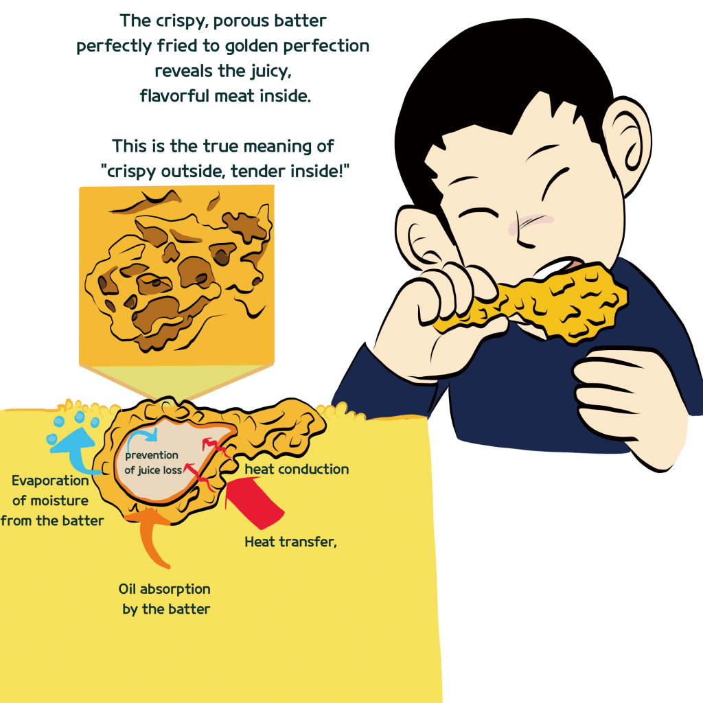 As hot oil penetrates the gaps left by evaporated water in the flour batter, it transfers heat to cook the food inside. The dried batter surface prevents oil absorption and water loss from the food, ensuring a crispy texture. Lower oil temperatures result in less effective water evaporation, leading to soggy textures. Conversely, temperatures above 390°F (200°C) cause rapid dehydration, burning the batter before the food cooks.