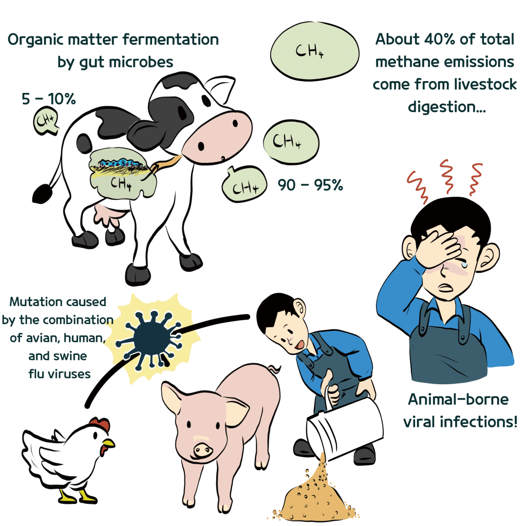 Commercial livestock farming offers a steady protein supply but also impacts the environment due to dense breeding conditions and excessive expansion. During my graduate studies in atmospheric chemistry, I discovered that livestock farming is a major methane emitter (about 40% of total emissions), contributing to greenhouse gases along with CO2 and N2O. Herbivorous animals like cows, goats, and sheep produce methane during digestion. Microorganisms in their stomachs break down organic matter, generating hydrogen, CO2, and methane. These ruminants, which regurgitate and chew their cud to digest tough plant fibers, rely on microorganisms to ferment and break down cellulose and fibers. This process produces intestinal methane gas, primarily expelled through belching. Interestingly, these microorganisms are a significant protein source for ruminants, providing 50 – 100% of their daily protein needs, which we then consume as meat.