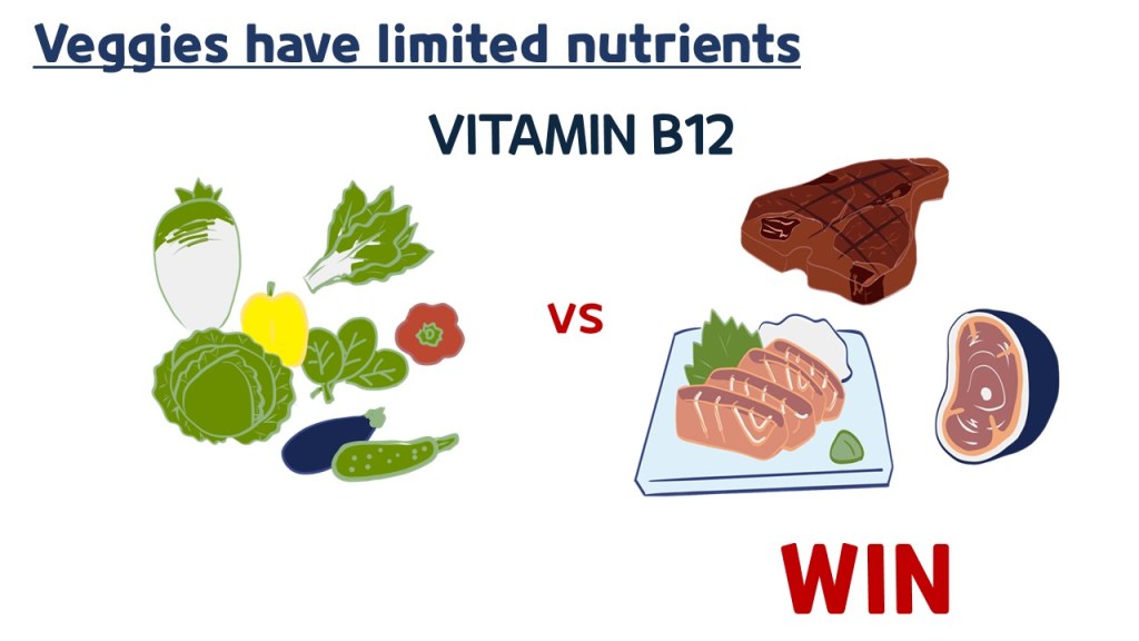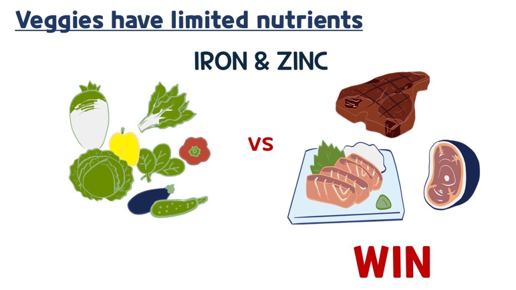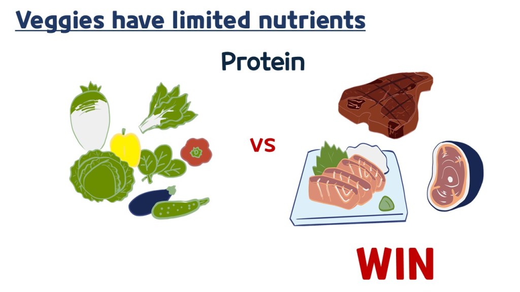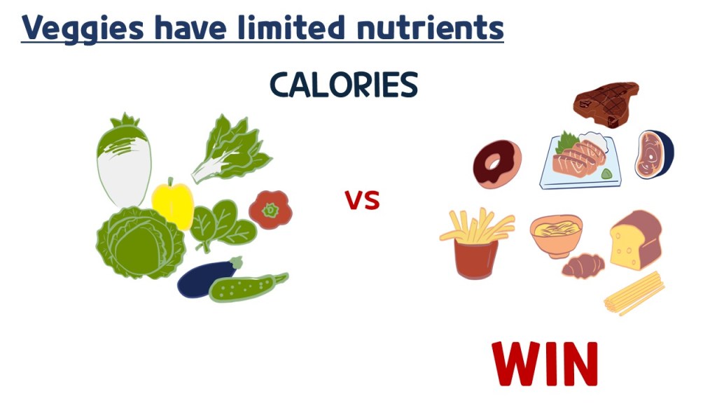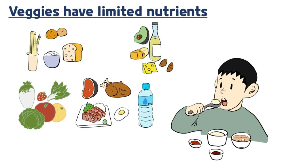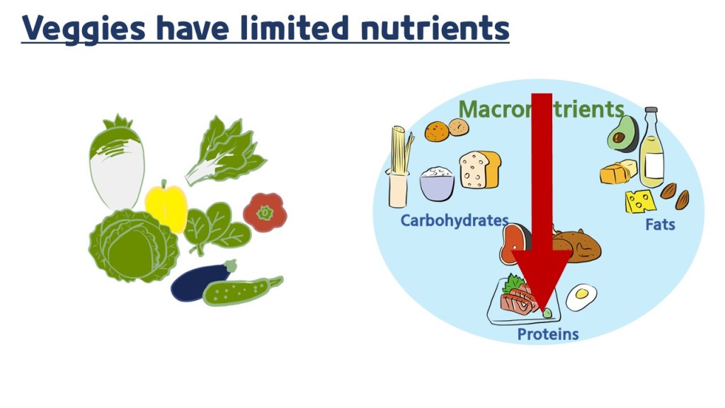 Veggies are super healthy but they don’t have everything we need:Protein: Veggies don’t have as much protein as meatVitamin B12: This vitamin is only in animal foods, not veggies.Iron and Zinc: Veggies have some, but our bodies absorb it better from meat.Calories: Veggies are low in calories, so they don’t give much energy.To stay healthy, eat a variety of foods like fruits, proteins, grains, and dairy—not just veggies!