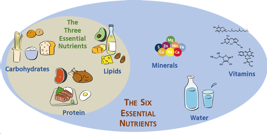 Carbohydrates, proteins, and Lipids (Fats) are called the three major nutrients, and when minerals, vitamins, and water are added, they become the six essential nutrients.